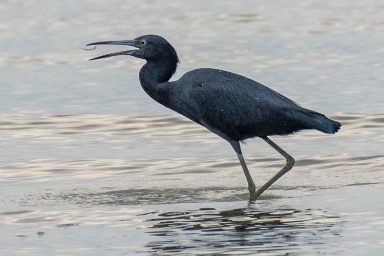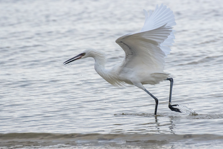 Here is a young white morph Reddish Egret hunting along the shore. Success!