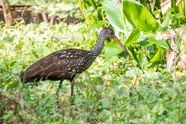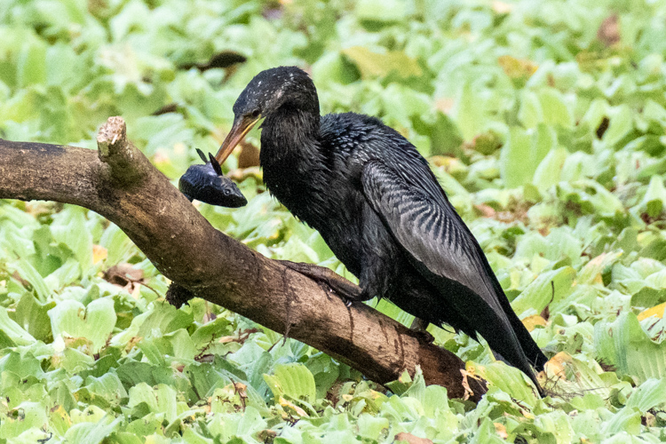 Another common sight is the Anhinga. They like to hang out on branches with their wings spread to dry after fishing for their lunch. This one looks to be figuring out how to maneuver that large fish down its throat and avoiding the spines on the dorsal fin. It succeeded after several minutes of thrashing it around. The silver highlights in their plumage can be spectacular in bright sunlight.