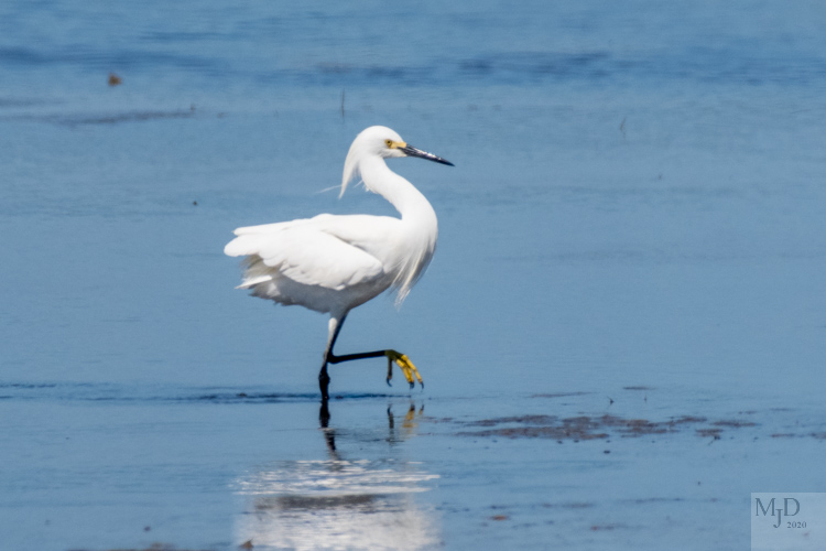 Snowy Egrets actively hunt small fish. The black bill is a good field mark but the bright yellow feet really stand out.