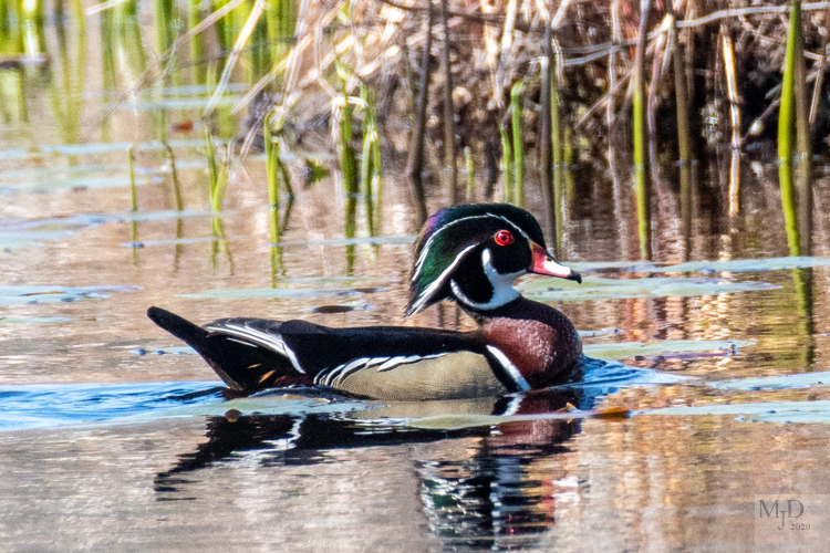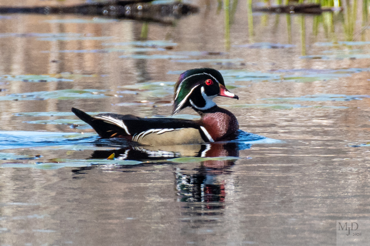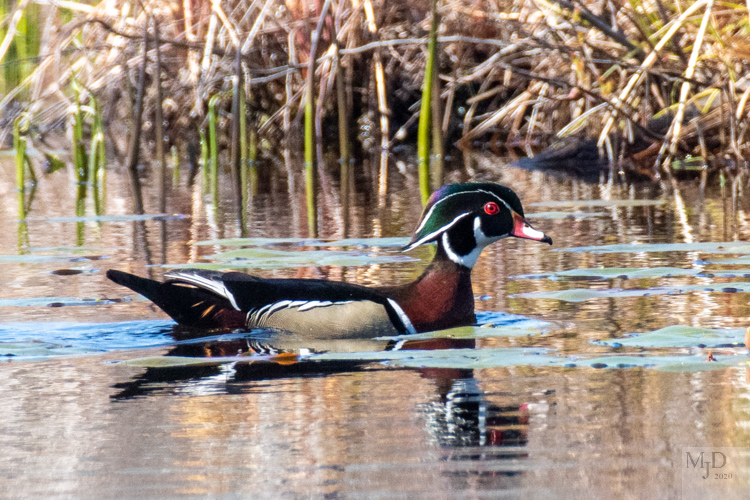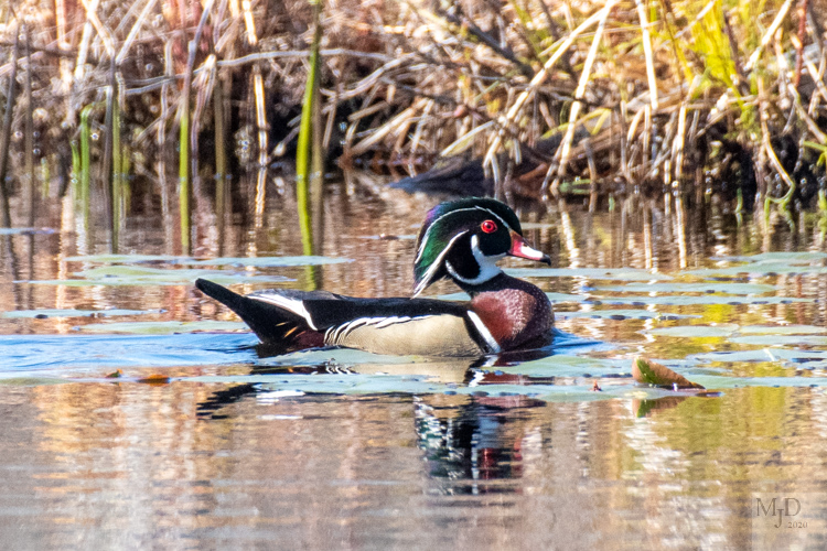 Wood Ducks are very colorful and very shy. So it was a good morning for me back in April when a brightly colored male swam across a narrow channel in the Ash Street Swamp (West Newbury MA) under decent light conditions. These are all pretty much the same pose but I can’t decide which one I like best!