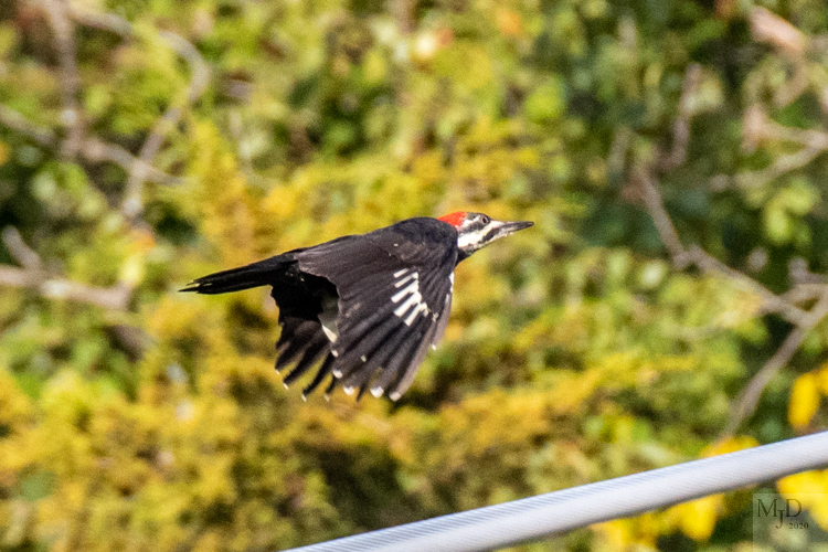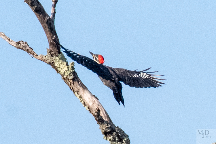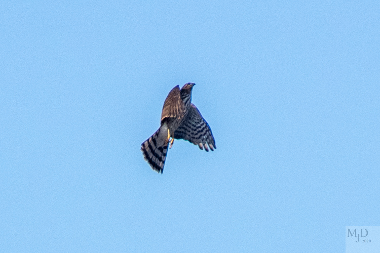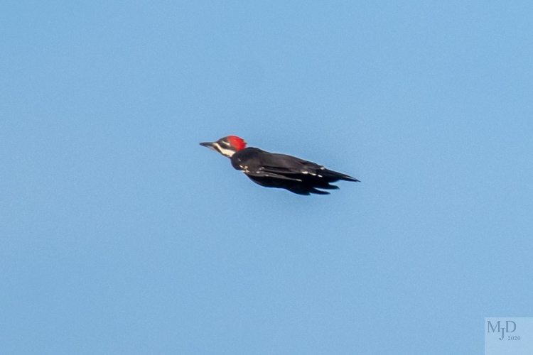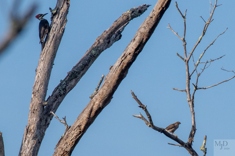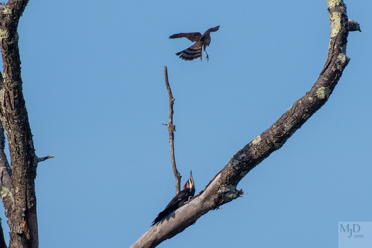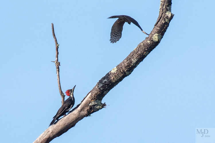 Some background. Sharp-shinned Hawks are small accipiters, about the size of a Blue Jay or Robin. Accipiters are fast, agile flyers that hunt small birds. The Blue Jays harass and mob them whenever they can. This accounts for part of the kerfuffle. We think the Flickers just joined in once the Jays got going. As with most birds, they just don’t like having these hawks hanging around. The Pileated Woodpeckers are about 50% larger than a Sharp-shinned Hawk. They may not fear the hawks but they did not appreciate being bothered by them. The two hawks were juveniles and may have been new to this sort of thing. They chased, and were chased, in and out of the tree for quite some time. They never caught anything and expended a lot of energy for no return.