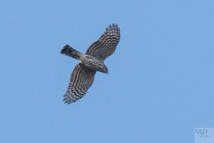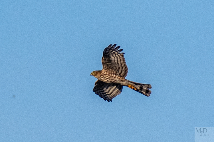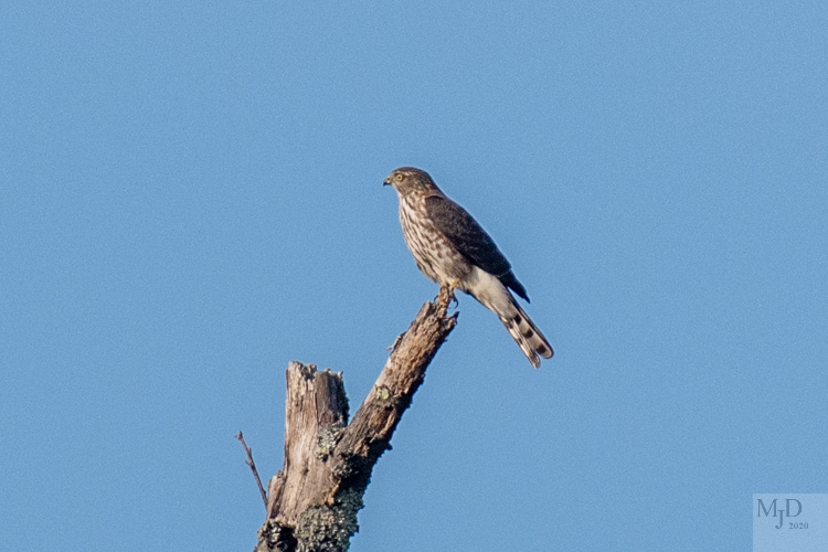 A birding buddy and I witnessed a real avian donnybrook the other day. We emerged from the woods next to a marsh and heard Blue Jays making a racket. Then we spotted a commotion in a big dead tree about 100 meters away. At first glance it appeared to be a raptor chasing another bird. But it turned out to be two Sharp-shinned Hawks, two Pileated Woodpeckers, two Northern Flickers and some number of Blue Jays in a continuous battle over who could use the tree.
