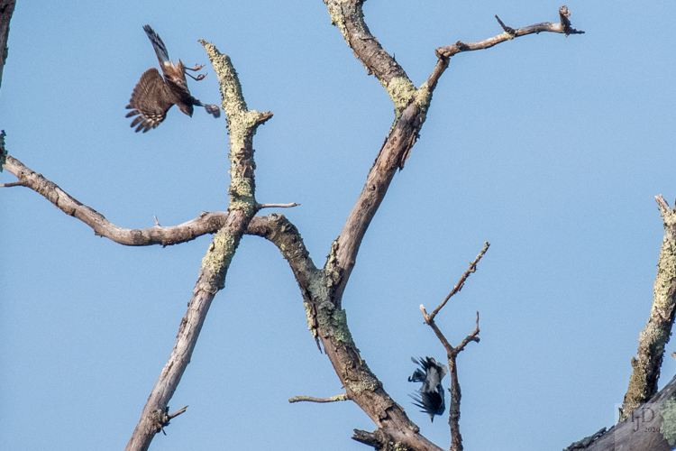The first round went to the hawk, who chased the woodpecker out of the marsh and across some power lines to the tree line on the other side.