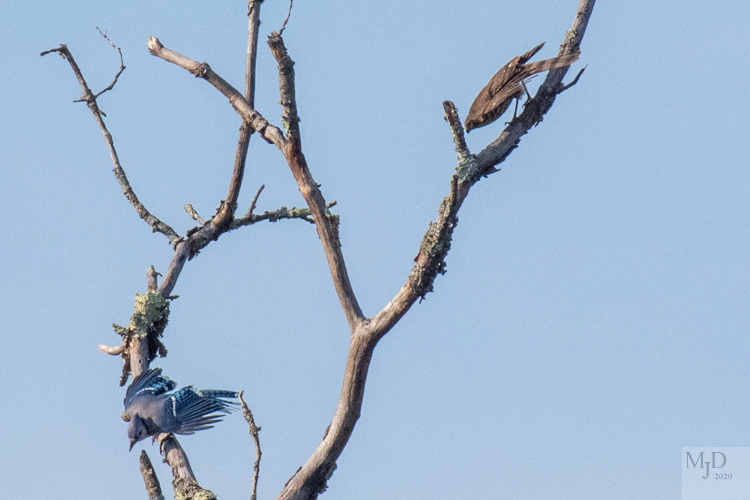 The Blue Jay can’t resist coming back and screaming at the hawk, who doesn’t appear to be amused.