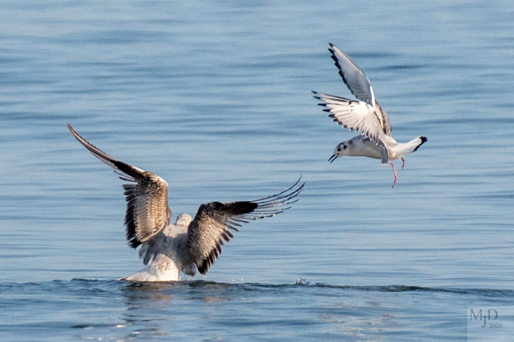 There have been some cloudy and rainy days lately, bringing much needed rain but making photography a bit more difficult. But the birds are out and so am I. One nice find was a Bonaparte’s Gull attempting to snatch something from a Herring Gull. The photos in my earlier post (Bonaparte’s Gull) didn’t truly illustrate just how small a Bonaparte is. This photo shows how petite (and spunky) they are.