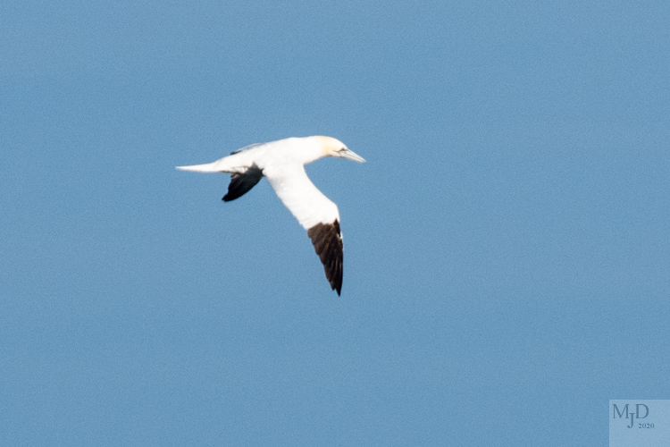 Northern Gannets are typically spotted diving for fish far offshore. We can only identify them by the way they dive, their shape and, if they get close enough for a good look in a scope, the black wing tips . But every now and then they come in close to shore for a photo op.