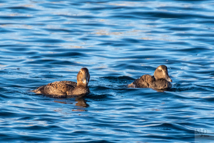 There were plenty of wintering ducks around though. Common Eiders were at several sites. Here’s a male in bright white and black plumage and some females sporting their cinnamon brown.
