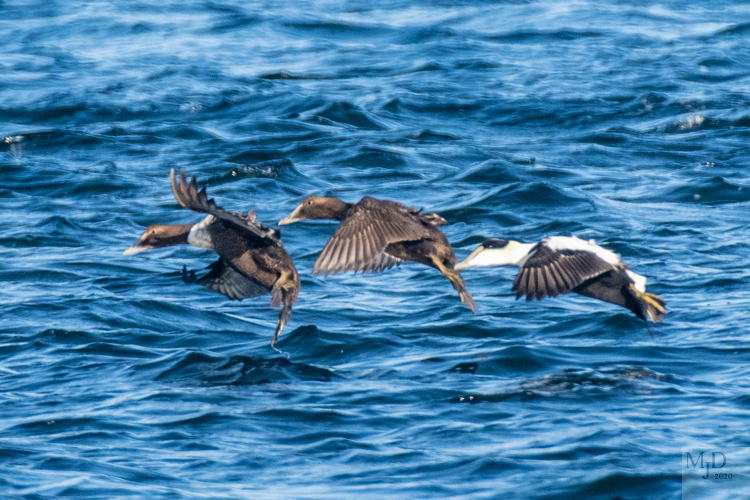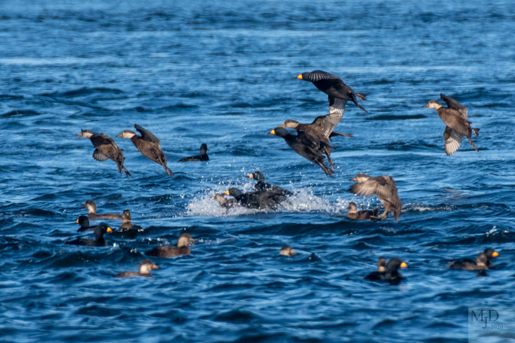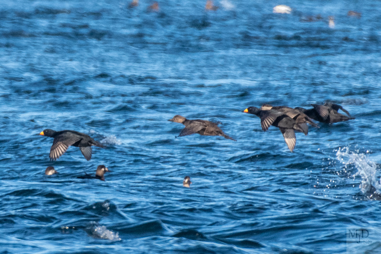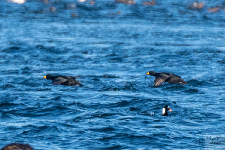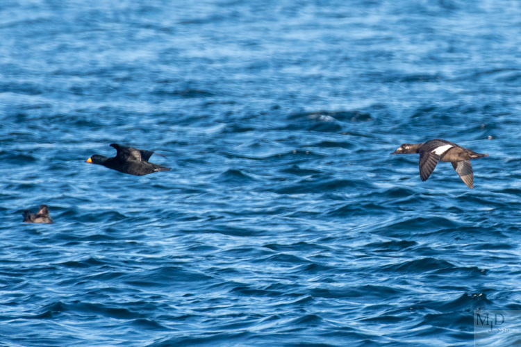 Black Scoters buzzing a Surf Scoter
