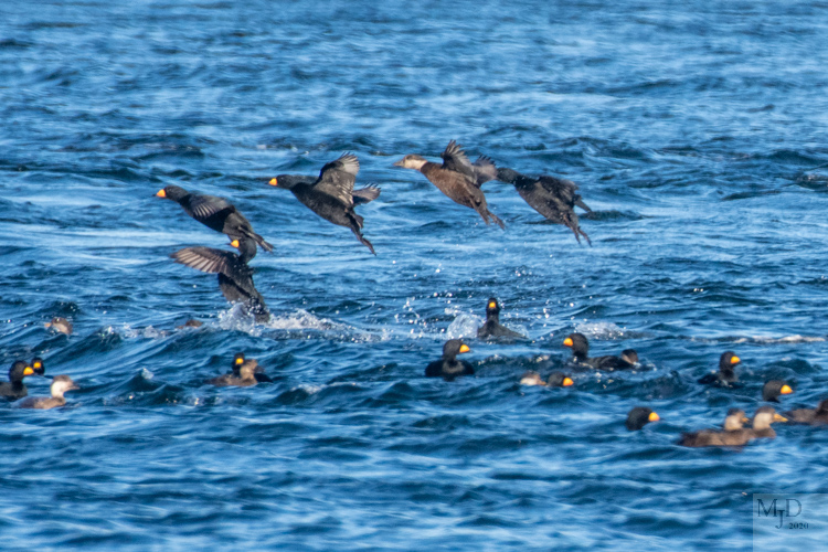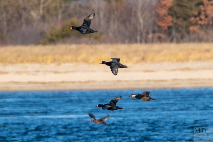 The ducks featured in my previous post were not all resting at the mouth of the river or diving. Some were flying in from the ocean and some were just moving from one part of the raft to another. Ducks are a big part of the winter bird scene here in Massachusetts so I will be featuring them a lot for the next few months. Here are some action shots.