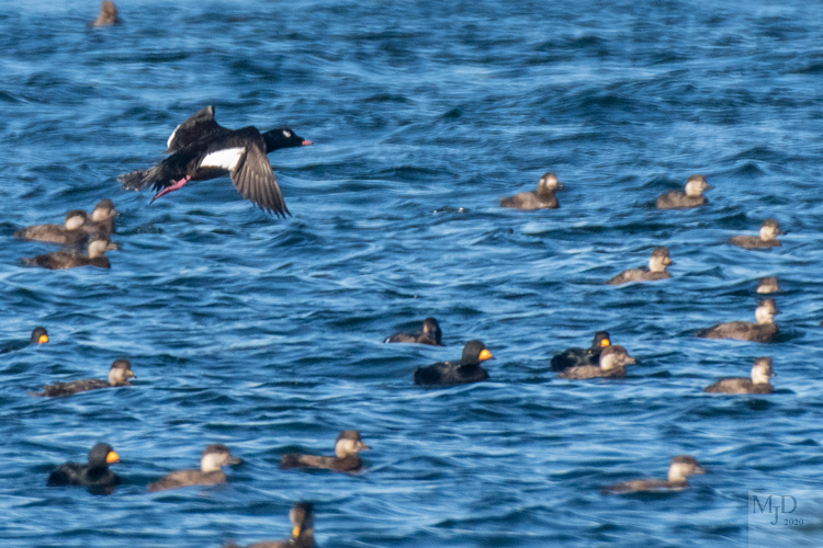 Male White-winged Scoter flying over Black Scoters