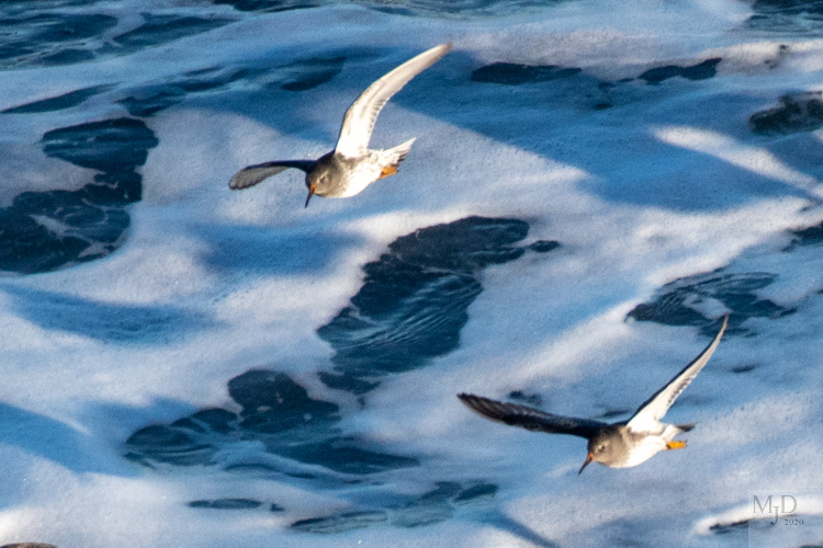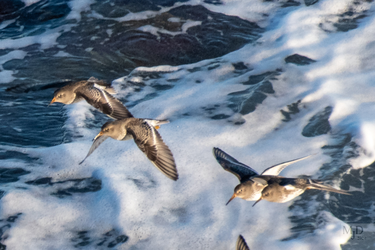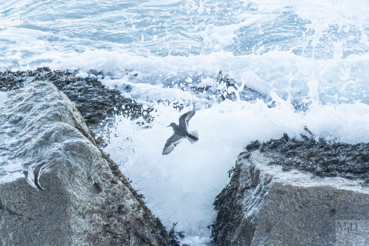 These photos were taken from a bluff overlooking the shore on the north side of Rockport Massachusetts at Halibut Point. It was a nice morning but there were long swells coming in from some storm offshore. Purple Sandpipers were flying from one set of rocks to another. They forage right at the surf line and flew right below us several times, giving me the chance to photograph them with the surf in the background.