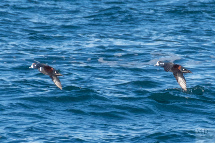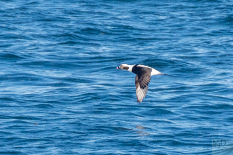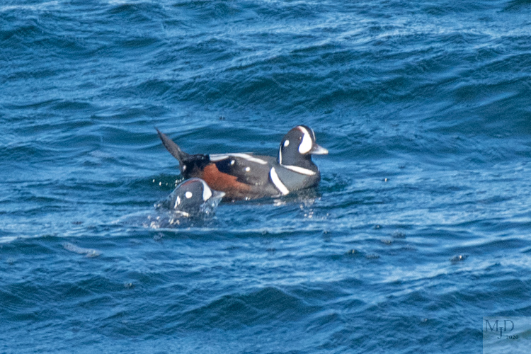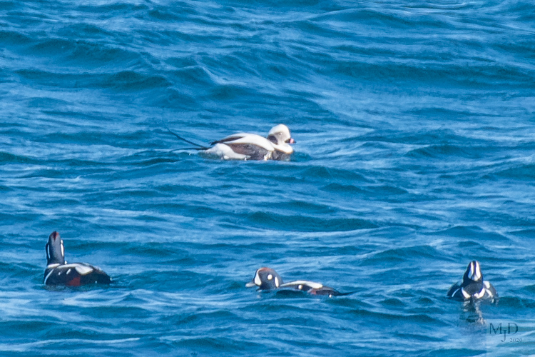 No trip to the shore is complete without some ducks. This is a male Long-tailed Duck displaying his long tail feathers with three Harlequin Ducks in the foreground.