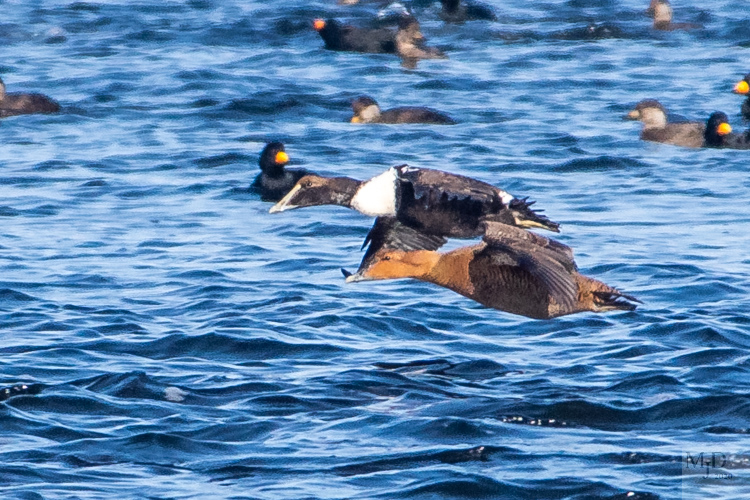 The most common ducks at the river mouth are Black Scoters and Eiders. These Eiders were flying past the Scoters as the came in from the ocean.