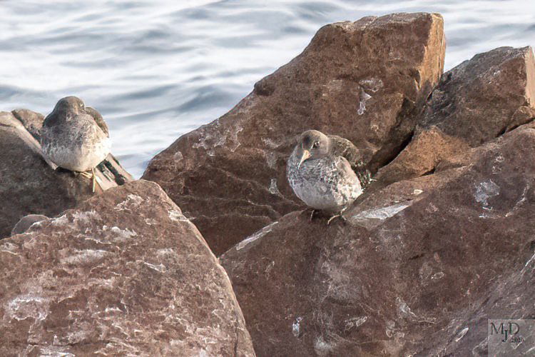 And finally, my first good looks at Grebes this winter. They were foraging fairly close to shore and close to each other. They don’t have their more colorful plumage this time of year though. The “no butt” Grebe body plan is evident. The top bird is a Horned Grebe and the bottom is a Red-necked Grebe.