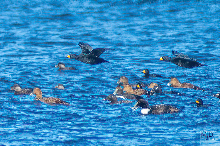 Male Black Scoters fly by a raft of ducks that includes Black Scoters, Eiders and one male White-winged Scoter with its white patch under the eye.