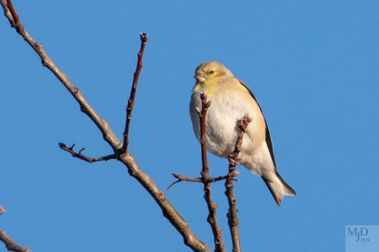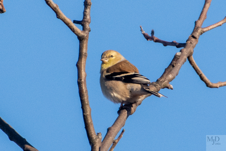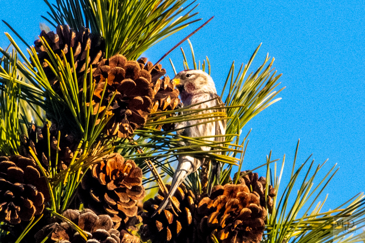 We had a nice break in the dismal weather and I managed to get out on a particularly sunny morning. It was great to have some blue sky in the background of my photos. My first encounter was a flock consisting mostly of American Goldfinches getting seeds from pine cones with a few other species mixed in. The Goldfinches were in their less colorful winter plumage.