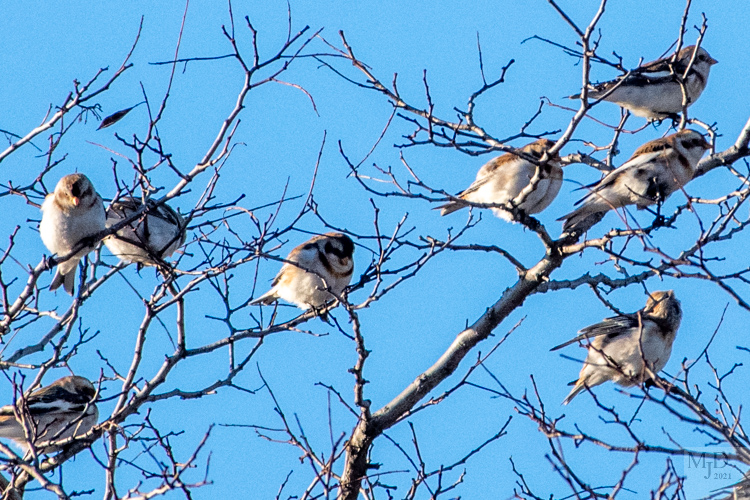 I really should put my backup camera with a shorter focal length lens on my harness. This is just half of a flock of Snow Buntings that was resting and preening in one tree. My long lens could not fit the whole scene in the frame. There were around 120-130 Buntings in the flock.