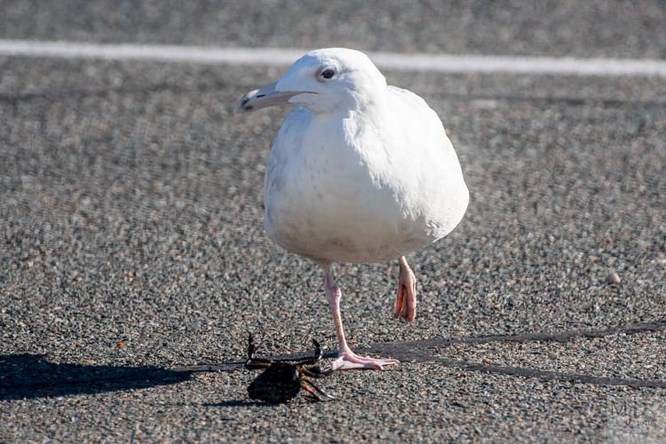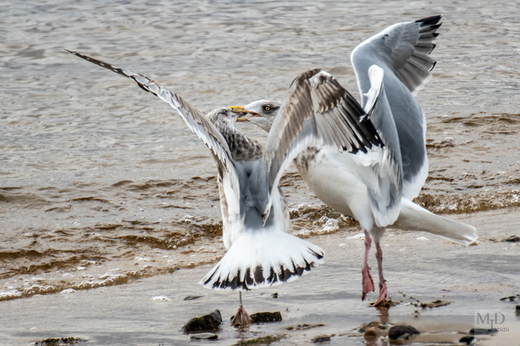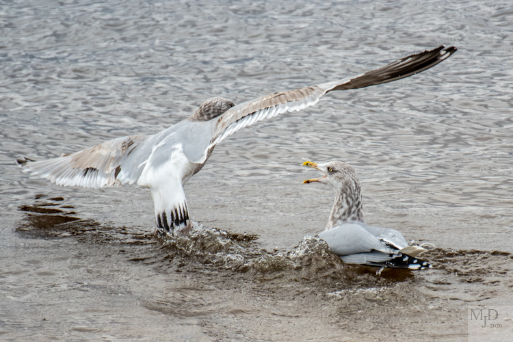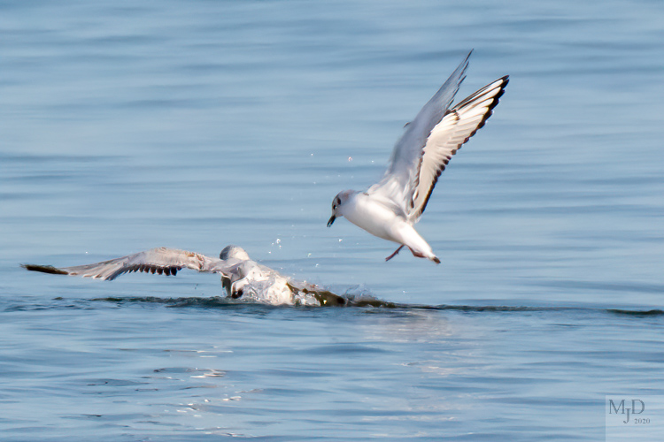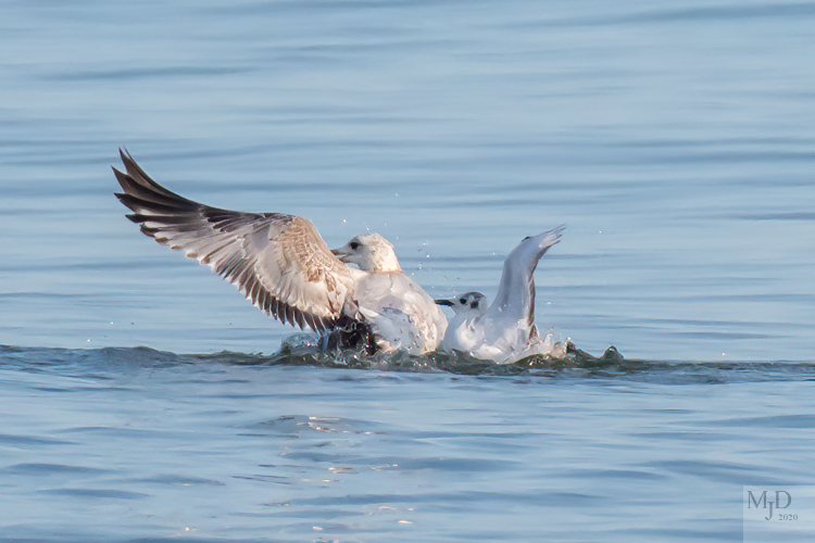 Who says there is honor among thieves? Here’s a Bonaparte’s Gull trying to grab something from a larger Herring Gull. Gulls are certainly bold pirates.