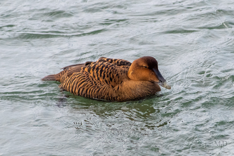 Next, Common Eider. This is a male hanging out among the weeds along the shore and a female that was resting in a canal below us. I think I like the female’s coloration better.