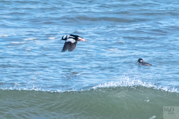 Here’s a male Bufflehead flying over the ocean swells. That’s a female riding the waves.