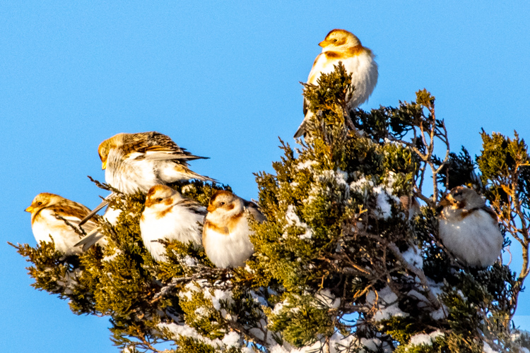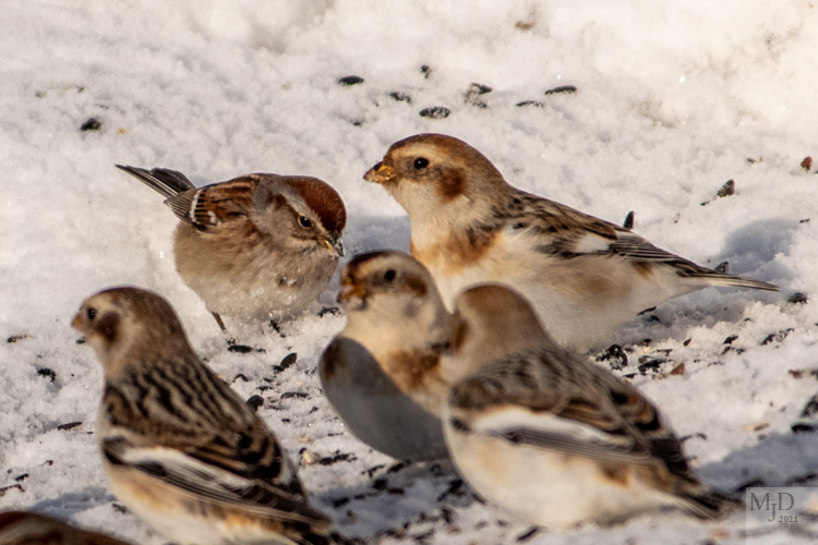 We are about half way through a cold and stormy February with hopes for a quieter and slightly warmer final week of the month. These are some photos I took last week during a lull in the weather action. There is a large flock of Snow Buntings wintering at the state park in Salisbury MA. This group was taking a break in the early morning sunshine and grabbing some seed that a local put out at the edge of a parking lot. They were joined by Black-capped Chickadees and various sparrows, including the Tree Sparrow in the bottom photo. And no, the birds aren’t getting fat. They fluff themselves up for insulation against the cold.