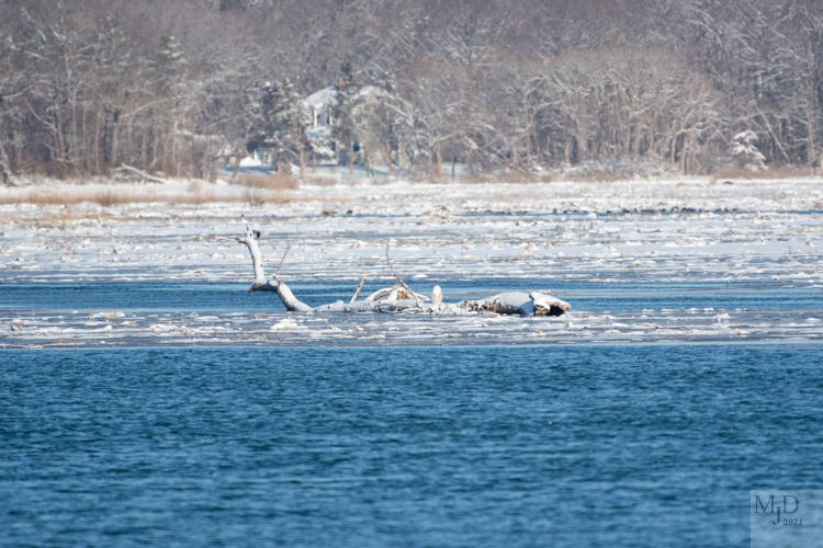 I spotted a Snowy Owl across the water while photographing the Lark. It was a matter of a noticing a little lump on a log in the distance. These are uncropped and cropped photos taken with a telephoto lens. He was about 250 yards (225 meter) away and barely discernable in my binoculars. They don’t call them “snowy” for nothing as they virtually disappear when there is a lot of snow and ice around.
