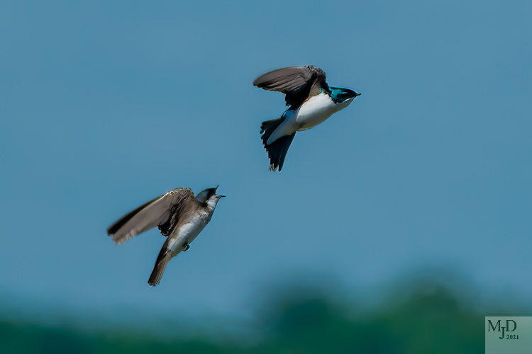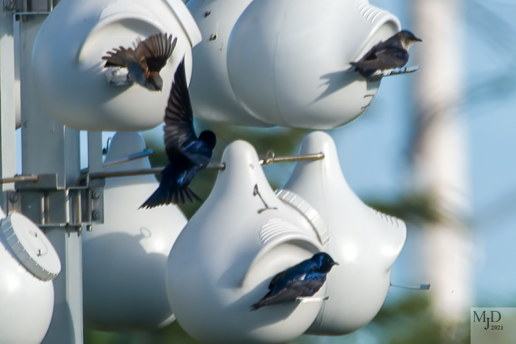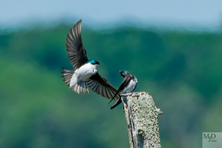 And finally, there were some Tree Swallows around the maintenance area as well. These are the most common swallows in our area. The males have a blue-green back, while the females are brown. They aren’t that gregarious during breeding season, as you can see below. But they gather by the thousands in the fall before heading to the south coast and Mexico for the winter. (The caption for the second photo could be: “I’ll park my butt where I like!”)