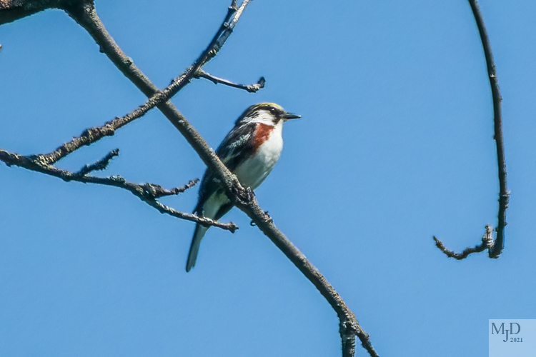 A Chestnut-sided Warbler perched on a dead branch long enough to be photographed.