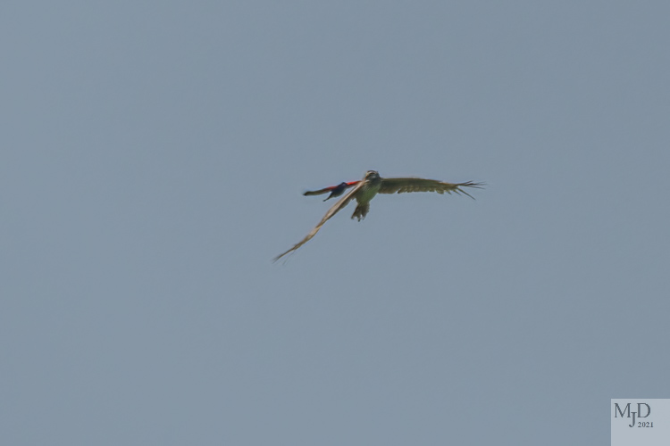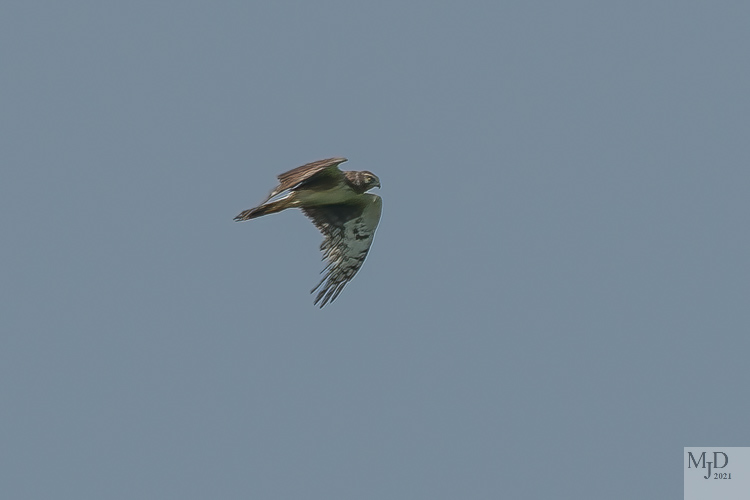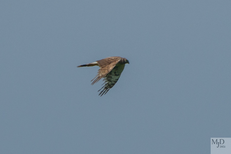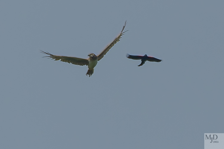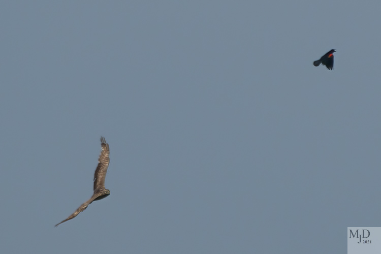 A female Norther Harrier flew over the field in the distance. They prey on small animals and birds in the grass so one Red-winged Blackbird buzzed her several times to keep her moving away from his nesting area.