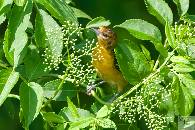 A female Baltimore Oriole stayed in the foliage.