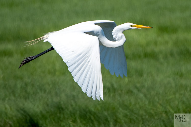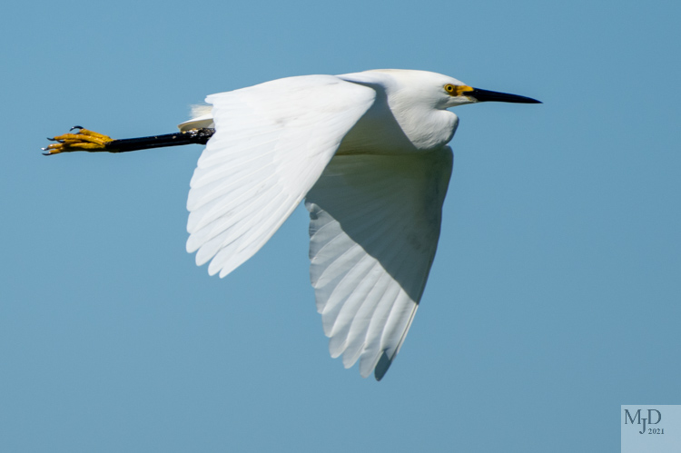 Two similar looking Egrets are common here in the summer. The Great Egret is bigger than the Snowy Egret so it is easy to tell them apart when they are near one another. They also hunt for food differently. But one sure way to tell which one is flying by is to look at the colors. The Great Egret has a yellow beak and black feet. It’s the opposite for the Snowy.