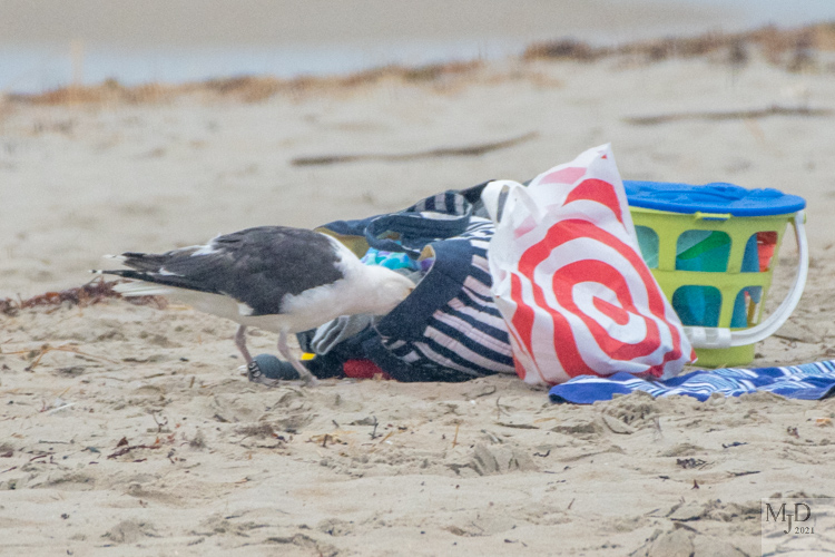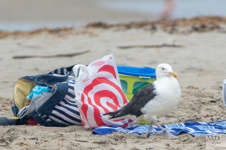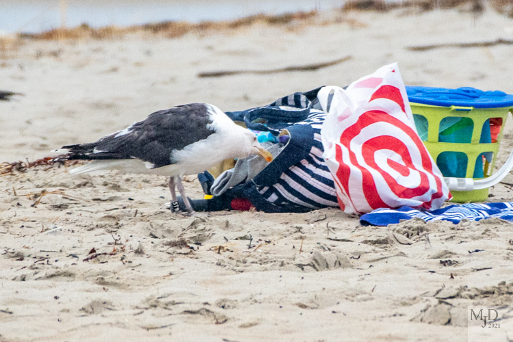 The owner came over and closed things up. But the gull only walked as far away as necessary. He returned as soon as the person went back down to the water. We kept walking down the beach so I can’t say how successful his raid was in the end.