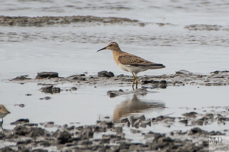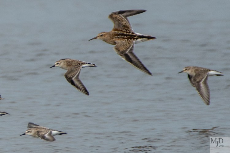 These are photos of two of the less common shorebird species that migrate through the Massachusetts coast. The first is the Pectoral Sandpiper. It’s a bit larger than the more common “peeps” like Semipalmated Sandpipers. The size difference is obvious in the photos of a Pectoral flying with the Semipalms. Note the buffy breast and long drooping beak.