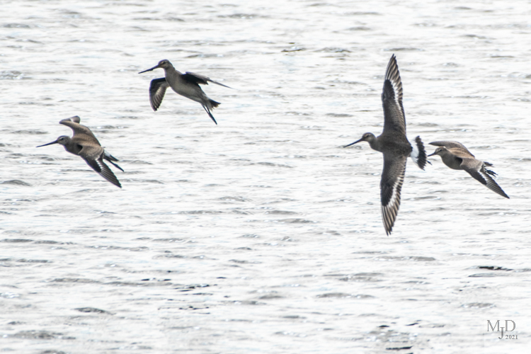 A bigger shorebird with an even longer beak is the Hudsonian Godwit. Four Godwits foraged and flew around the Hellcat area at the refuge. The bottom photo shows the size difference between a Godwit and a Dunlin. Dunlins are a little bigger than a Semipalmated Sandpiper so Godwits really tower over the little peeps. (“Peeps” is the name given to the three very similar looking small sandpiper species that are in mixed flocks: Semipalmated, Least and Western Sandpipers)