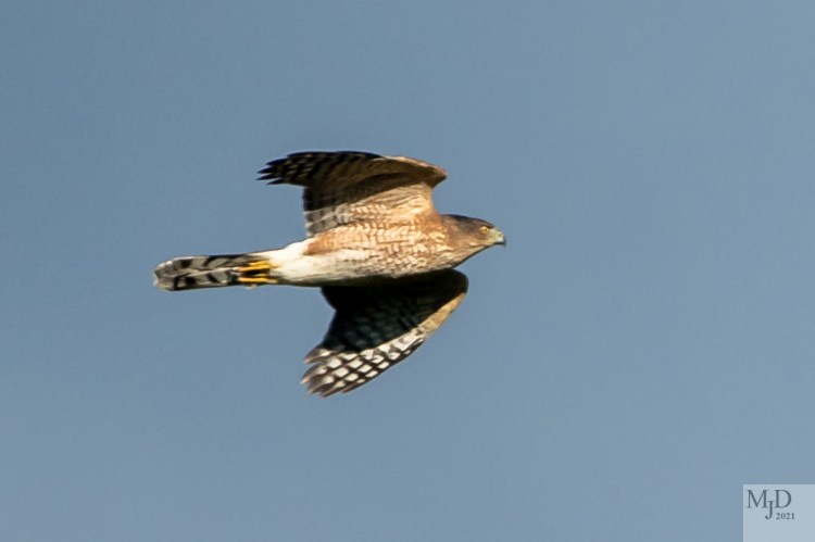 One thing all of these birds need to worry about is this bird. The Cooper’s Hawk, along with the smaller but very similar Sharp-shinned Hawk, is an accomplished bird hunter. It’s shape and long tail make it fast and agile enough to chase down smaller birds, even through the trees. Both are visitors to bird feeders but not for the seeds.