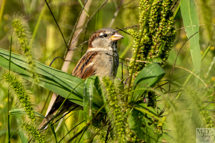 The House Sparrow is widespread and numerous. They are highly adapted to living near humans and are always found close to farms, houses, etc. It is not a native species in North America or Asia but was introduced from Europe. The first flock was brought to New York City from England in the 1850s to control a caterpillar. It is still referred to as an English Sparrow in the US even though the official name is House Sparrow. This is a young or non-breeding male and doesn’t have the full black bib on the throat and upper chest.