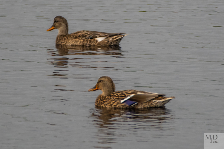These are a female Mallard (front) and a female Gadwall. Note the white patch on the Gadwall.