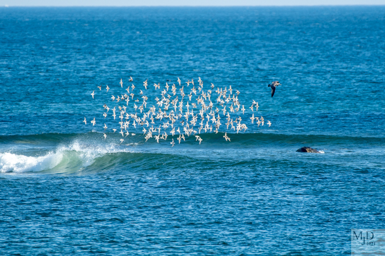 I was with several other people on a platform overlooking the beach at Emerson Rocks on Plum Island. We were observing and photographing hundreds of shorebirds that had gathered on the beach and rocks. The number of birds was gradually declining as the tide came in but there were still several flocks on the beach. One flock took to the air and flew back and forth across the water over the now submerged rocks.