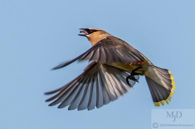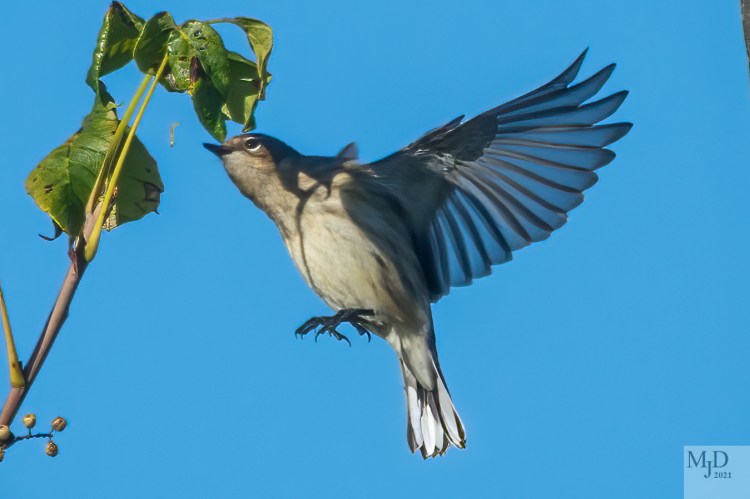 These pictures of a Cedar Waxwing snatching a flying insect and a Yellow-rumped Warbler going after a dangling caterpillar are the result of being prepared, persistence, a bit of luck and a big memory card!