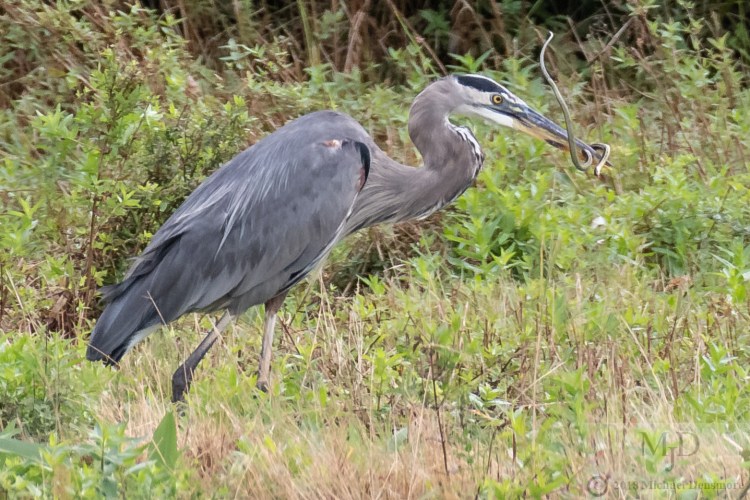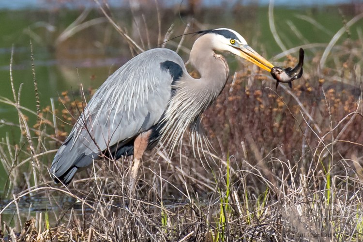 Great Blue Herons are excellent stealth hunters and will eat anything they can get down their throat. I once missed getting a shot of one grabbing a field mouse but I did get these.