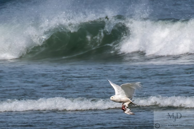 This is a favorite of mine. Our group spotted a Snowy Owl in the exposed rocks just offshore. It was hunkered down with his meal, a gull. The tide was beginning to cover the rocks and it finally had to grab his lunch and fly to a drier location.