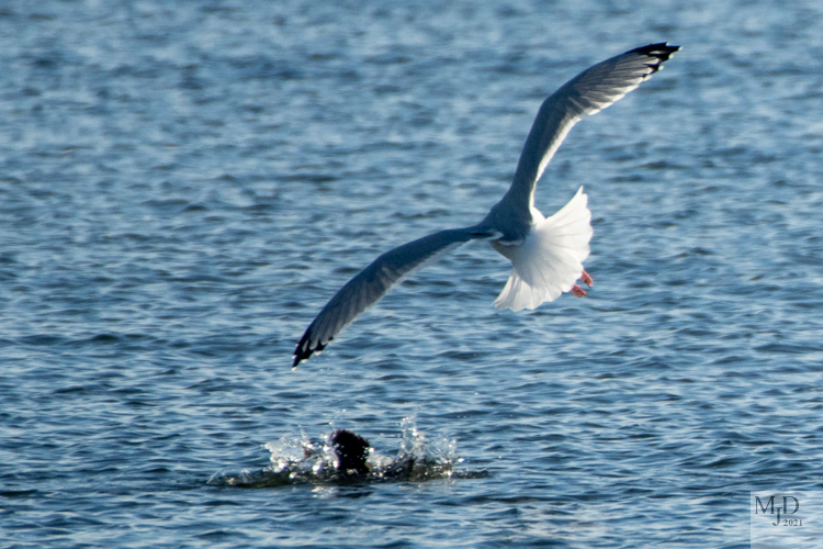 Anyone who sees my posts on a fairly regular basis knows that I can’t resist gulls being pirates stories. This sequence shows a Herring Gull swooping in on an Eider in attempt to steal its catch. The Eider dove to escape the raid.