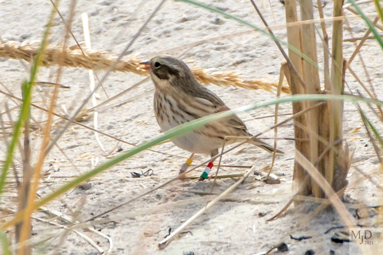 This little sparrow is sort of special. The colored bands are used to track this subspecies of Savannah Sparrows known as Ipswich Sparrows. They breed on Sable Island in Nova Scotia and appear along parts of the New England coast in the winter. It’s a small population and they are being tracked by scientists and birdwatchers. This sighting, along with the band colors and arrangement, were reported to the group that tracks them.