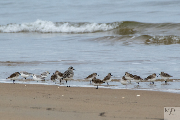 There was an interesting small flock of mixed shorebirds on the beach. They took flight together and made a couple of passes in front of the beach before disappearing further along the shore. There was one larger Black-bellied Plover hanging out with a group of Dunlins and Sanderlings.