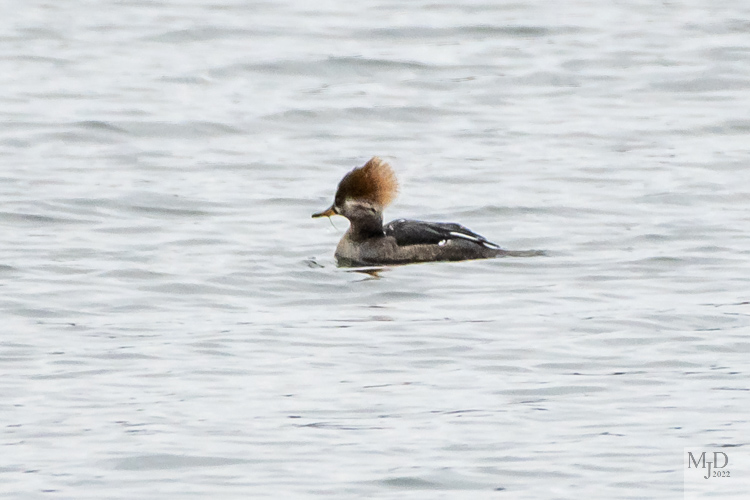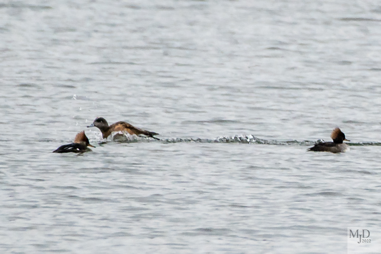 I returned to a nearby lake after photographing the Goldeneye in my previous post (https://wordpress.com/read/feeds/106869995/posts/3754995295). There was still a large area of open water but the ducks congregated on one end of the lake. Several species were mingled together. These are Hooded Mergansers (top: male and bottom: female) showing the fan shaped crest that give them their name.