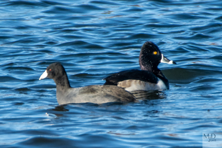 The following are some mixed groups. The first includes a non-duck though. It’s an American Coot swimming with a Ring-necked Duck. There is a very faint ring on the duck’s neck but I think it would be more appropriate to call it a “Ring-billed Duck”.