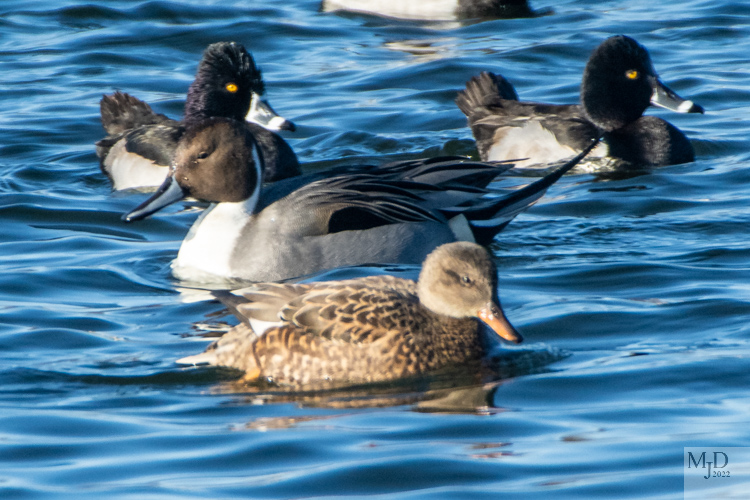 This shot includes a Northern Pintail (white stripe along the neck), a female Mallard and two Ring-necked Ducks.