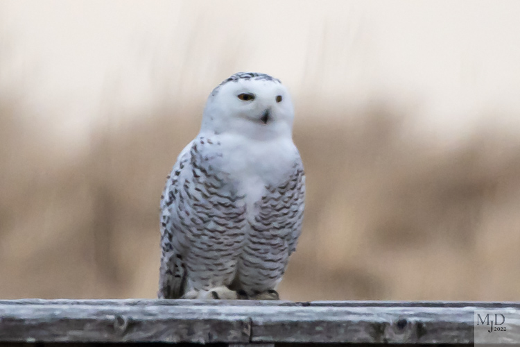 There are two Snowy Owls being observed near the mouth of the Merrimack River that seem to have set up winter residence in the area. I took these pictures near the main parking lot of a state park. We were looking at one owl that was sitting on the railing of the boardwalk from an adjacent lot to the beach. Then we spotted the second owl in the grass next to the lot we were in. We had to move back once we noticed it since we were too close to it for it’s comfort.