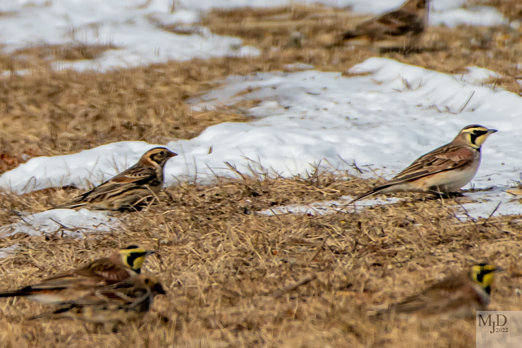 Horned Larks are relatively common during the winter. Lapland Longspurs are a little harder to find. This photo is from a mixed flock that was foraging in some bare spots in the Salisbury State Reservation. There were an unusual number of Longspurs in the flock. The Longspur is on the left, with the Lark on the right.