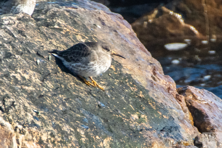 These two Purple Sandpipers were part of a small flock we spotted in Gloucester. One was relaxing the sun for a bit as the other gingerly made its way down to a rock at surf level. They joined up to look for some yummy morsels.